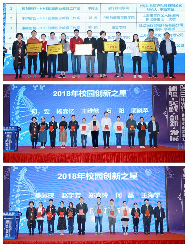 开幕式上,唐红梅、孔宪明共同为学校立项的5个HHE创新创业教育工作室(智慧医疗、小护智创、康康创智、医工影创、MR协同教学)授牌,为何雯等20名2018“校园创新之星”颁奖。迈动医疗器械科技有限公司常务董事李建彬、美承数码科技集团有限公司总经理陆周青、上海胧爱文化传播有限公司CEO蒋公宝、上海仲慈医疗科技有限公司创始人于旸紫巍等作为各HHE创新创业教育工作室的合作伙伴代表参加了授牌仪式。