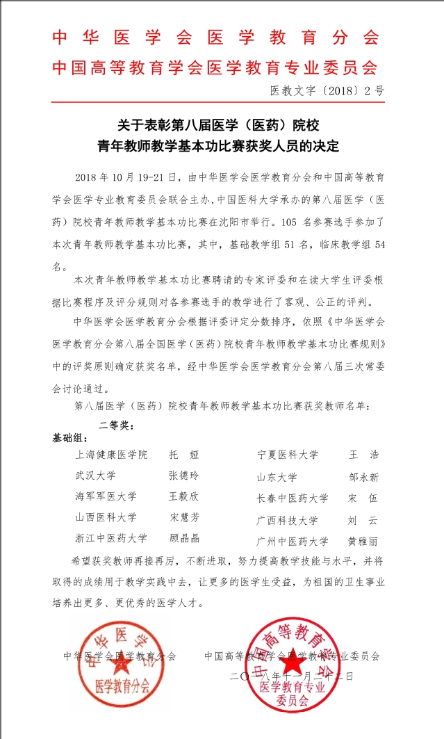 最近,从中国高等教育学会医学教育专业委员会传来喜讯,上海健康医学院青年教师托娅荣获第八届全国医学(医药)院校青年教师教学基本功比赛基础组二等奖。这是我校教师在此项全国医学院校最具影响力的教学大赛中,首次在基础组荣获二等奖。