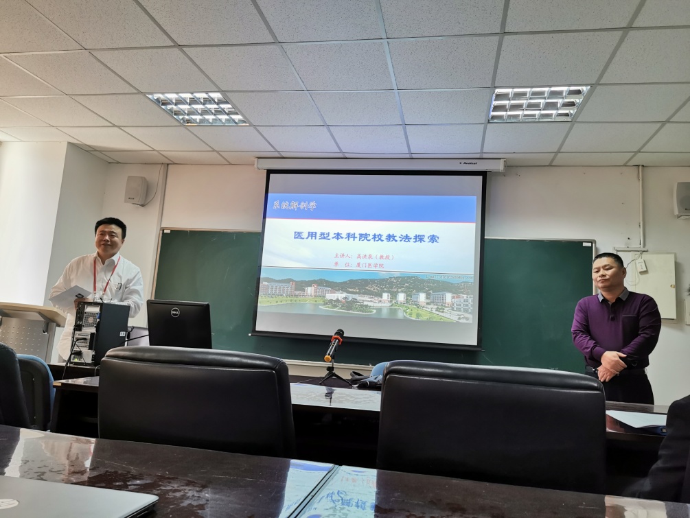 11月7日,厦门大学基础医学院高洪泉教授应杨智昉院长邀请,来我院进行《医用型本科院校教学方法探索》讲座。在讲座中,高教授分别以心脏、血液循环、脑和脊髓为例,重点讲授了如何整合解剖、生理、病理、以及药理,将知识点融合贯通,加深学生的理解。并用自己生动简洁幽默的口诀,使学生课后留下深刻的印象。在高教授的讲座过程中,每遇精彩之处,学院教师频频报以热烈的掌声,并与高教授进行了交流探讨。该讲座对于提升我学院学术探讨氛围,探索更好的教育教学方法起到了极大的促进作用。(基础医学院)