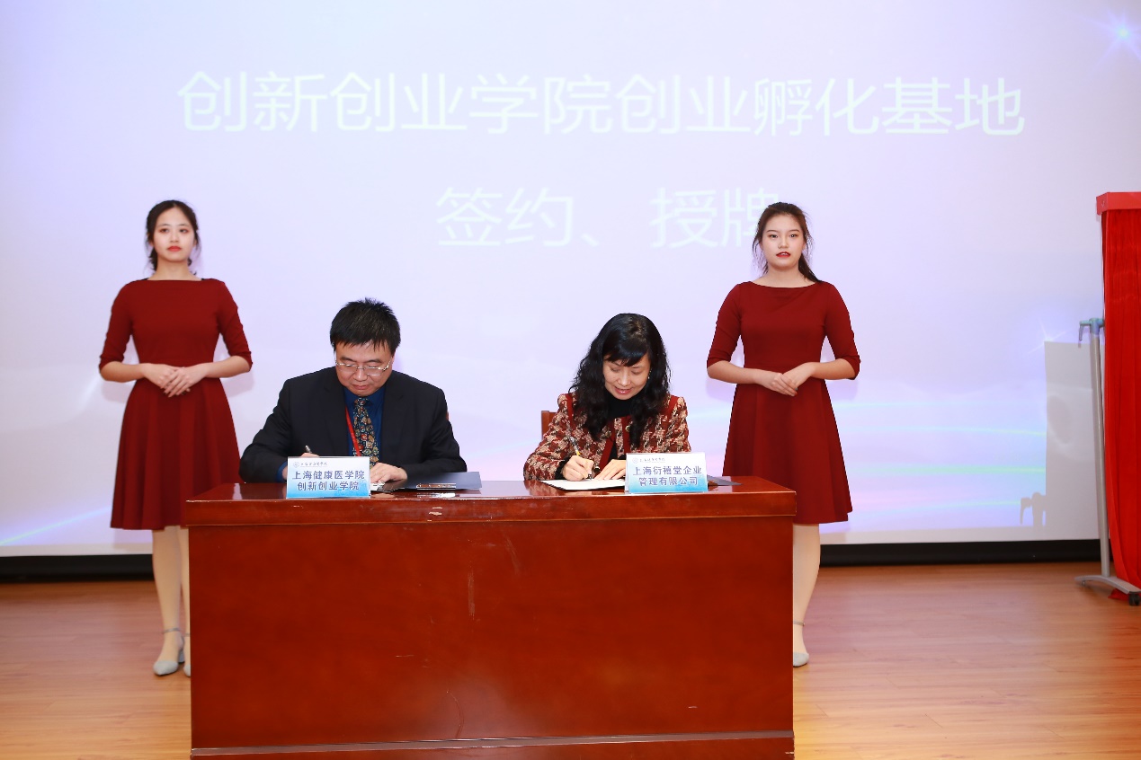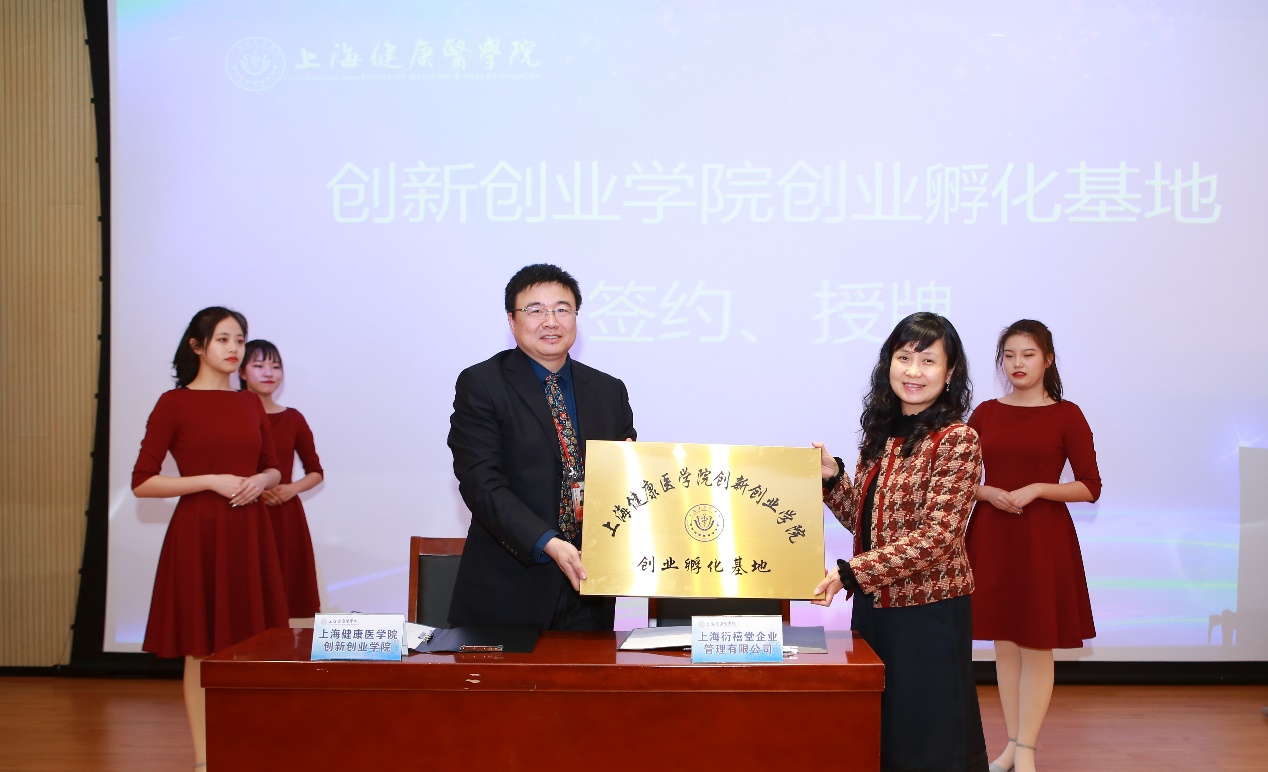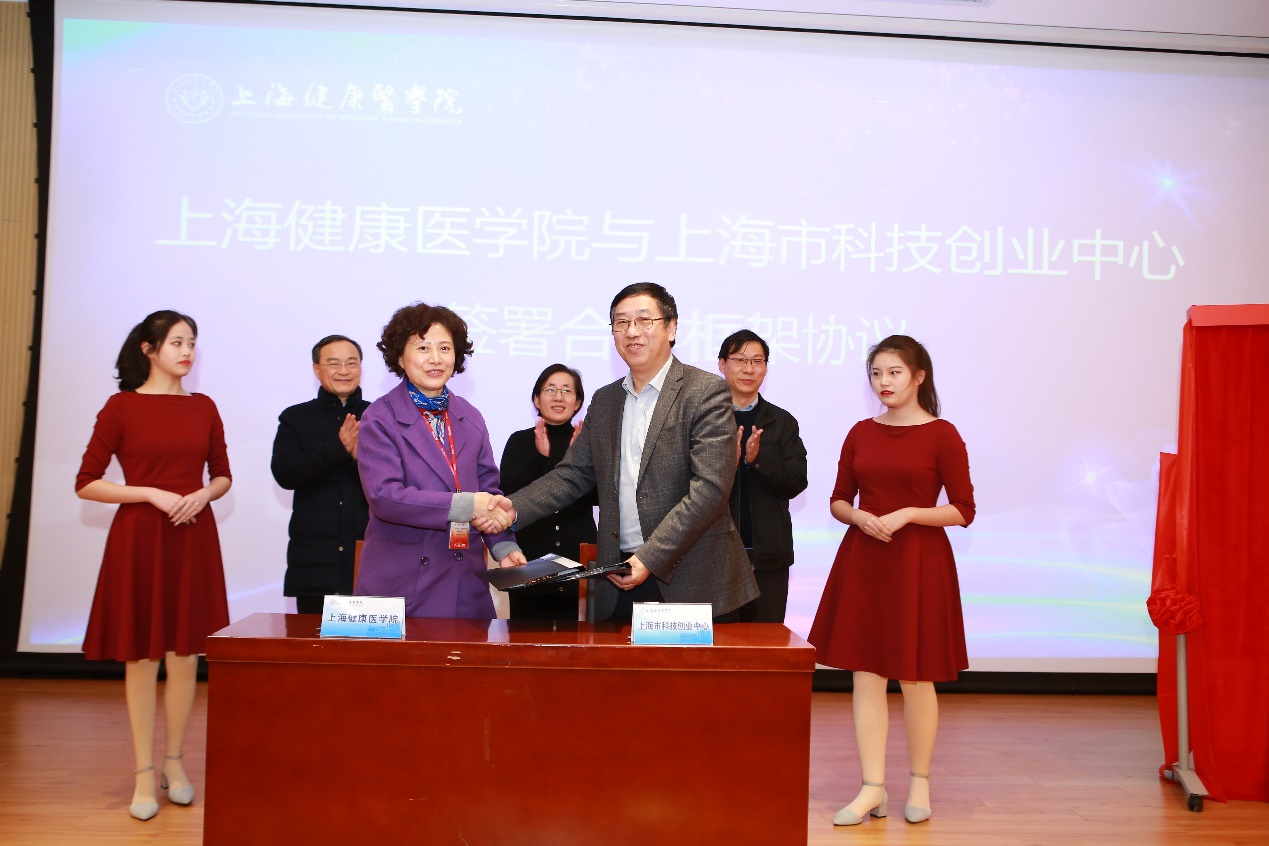 仪式由教务处处长张梅主持。首先,上海健康医学院副校长唐红梅与上海市科技创业中心主任朱正红共同签署学校与市科创中心的合作框架协议。