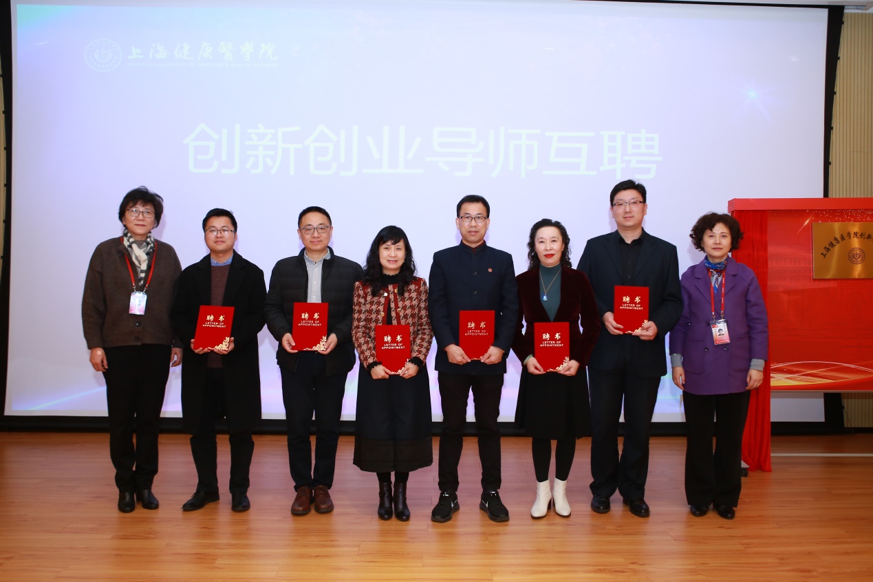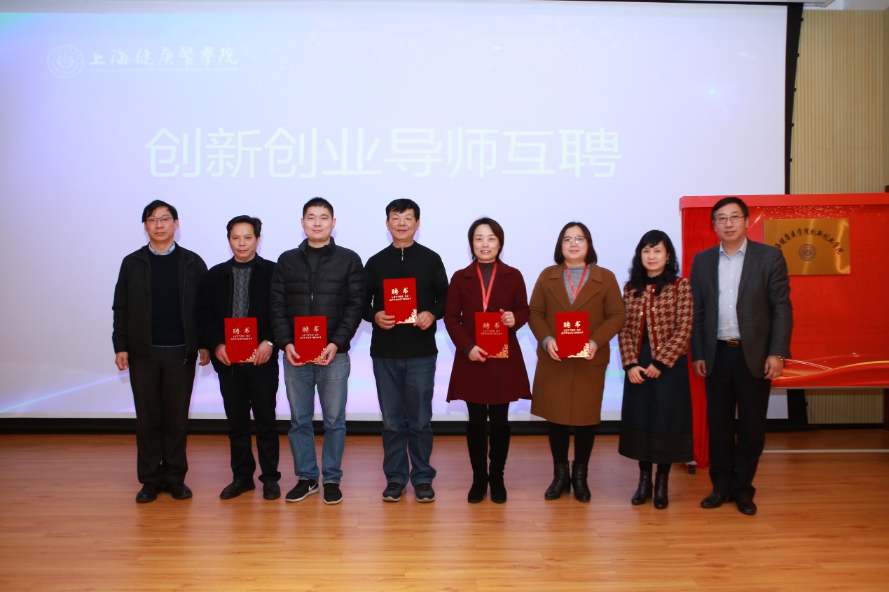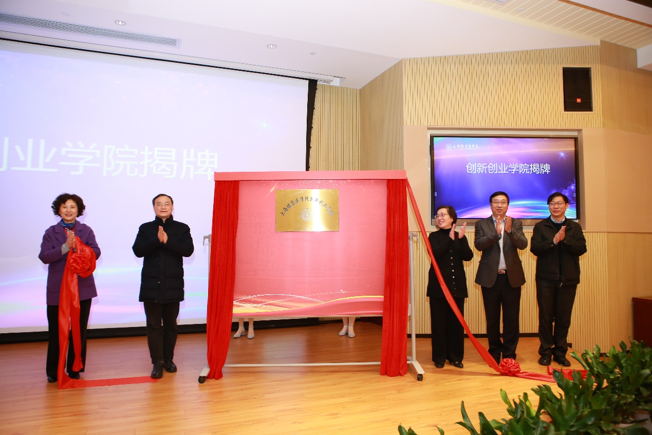 上海市科技创业中心主任朱正红、党委书记王震,校党委书记郑沈芳,校党委副书记、校长黄钢,副校长唐红梅,共同为“上海健康医学院创新创业学院”揭牌。