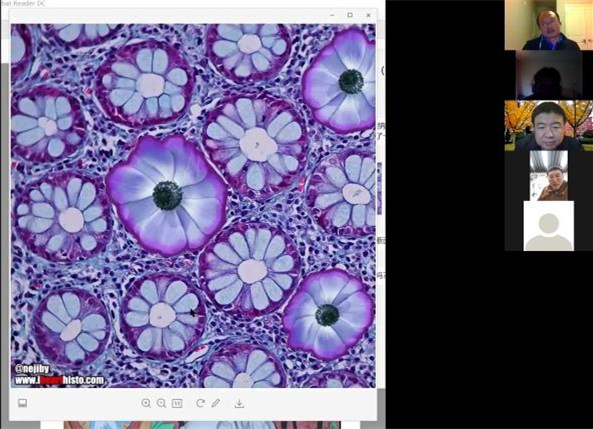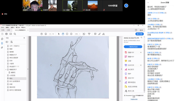 2020年4月11下午3时,基础医学院举行解剖学绘图大赛作品专家指导视频会,会议由远在美国访学的人体解剖与组织胚胎学教研室主任李志宏主持,基础医学院院长杨智昉、特邀画家吕老师和参与作品创作与指导的基础医学院师生40余人出席。