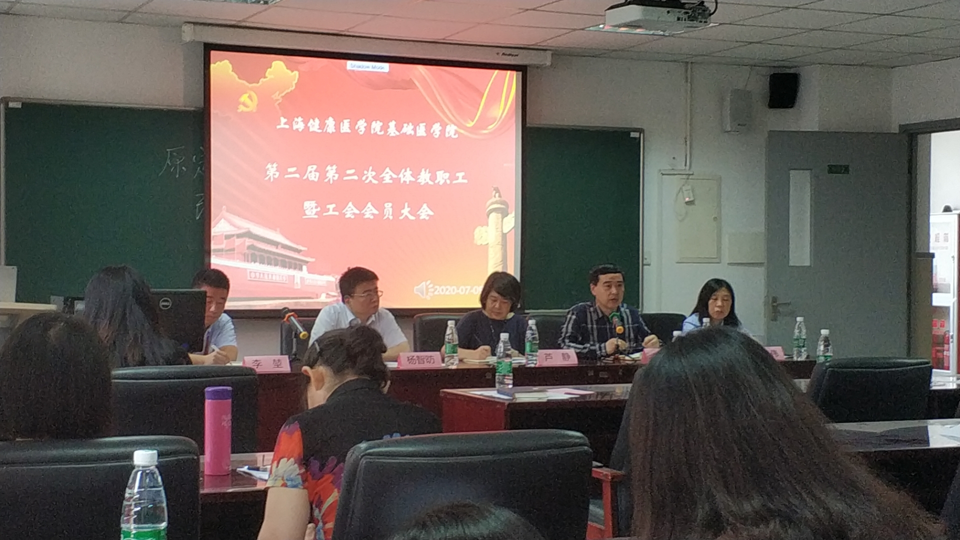 顽强奋进,向前向前。在抗击疫情取得阶段性成果,全校上下深入推进“四史”学习、推动学校“应用型、特色性、国际化”建设的重要时期, 7月9日,基础医学院第二届第二次全体教职工暨工会会员大会在北苑4号楼602会议室举行,校党委副书记、纪委书记李明磊、院长杨智昉、校工会副主席芦静、学院全体教职工出席会议,会议由基础医学院直属党支部书记程伟、部门工会主席李堃分别主持。