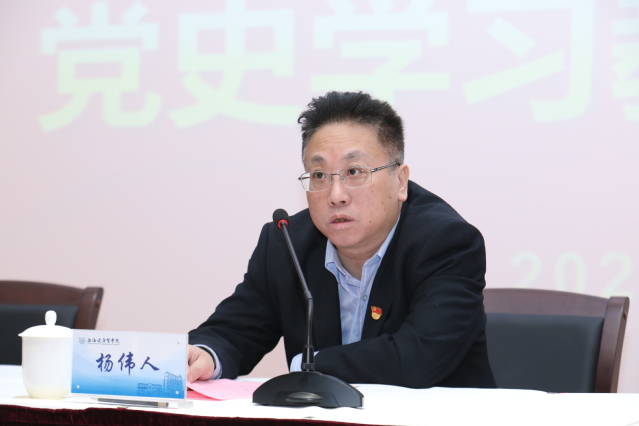 杨伟人强调,要精准把握重点,用学习成果助力学校“十四五”事业发展开好局起好步。开展党史学习教育是当前和今后一段时期学校各级党组织的重要政治任务,要把握好学习教育的目标任务、基本要求和核心要义,确保学习教育组织到位、措施到位、落实到位。要注重凸显特色开展党史学习教育,突出上海作为中国共产党诞生地的独特地位,突出教育卫生领域的特点,努力把红色基因传承好、把红色传统发扬好。要深入挖掘校史、校训、校歌、校友中的红色医学史核心元素,用党领导医务人员创建伟大成就和师生身边的人和故事育人,广泛开展校史校情教育。要注重以上率下开展党史学习教育,党员领导干部要坚持以上率下示范带动学,先学一步、学深一步、常学常新,带着信念学、带着感情学、带着使命学;各级党组织要以突出政治功能为重点,把党史教育贯穿全年组织生活始终,做到抓在经常、融入日常。要注重紧扣实字开展党史学习教育,开展党史学习教育,关键要落实习近平总书记强调的一个“实”字要求,把解决问题、推动学校事业发展作为衡量的标尺,推动全校党员、干部从历史中找答案,从现实中找参照,当好善作善成的实干家;要结合学校中心工作,服务学校新一轮改革发展大局,坚持学史和工作融合并举、融会贯通、整体联动,在持续推进简政放权、提升管理服务效能上实现新突破,在以应用型人才培养为核心、深化教育教学模式改革上实现新突破,在深入实施课程思政建设,全面提升立德树人能级上实现新突破,在高素质专业化干部人才队伍建设上实现新突破,在全面从严治党落实上要有新作为,努力建设具有鲜明特色、国内一流、国际知名的应用型医科院校,为推进健康中国和健康上海建设、保障人民健康提供更强有力的人才保障。