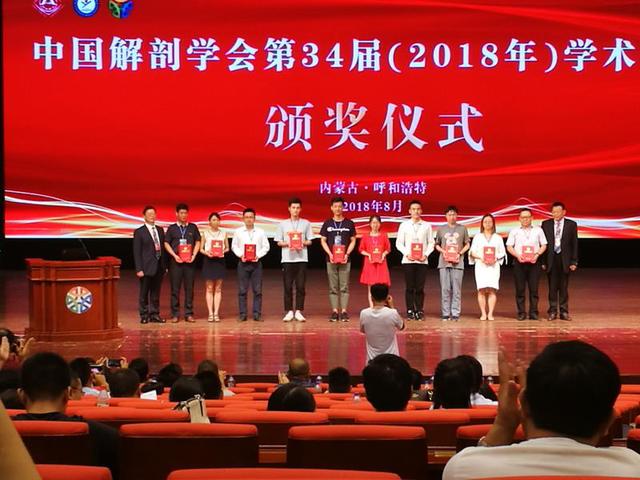 2018年7月30-8月4日,在呼和浩特举办的中国解剖学会第34届(2018年)学术年会共有200多个医学院校的800余人参会,会议是中国解剖学科的最高水平的学术会议。我院何希彪老师递交的论文板报“Necessity of vitamin c for the development of embryonic midbrain dopamine neurons ”,从一百多个板报中脱颖而出,荣获仅有的十个优秀论文板报奖之一,该奖项由中国解剖学会理事长张绍祥、秘书长周长满颁奖。我院汪慧菁副院长在分会场作题目为“背根神经节中IB4(+)感觉神经元GRK2/Epac1信号通路在小鼠痛觉敏化中的作用”的学术交流,受到同行的广泛关注和好评。